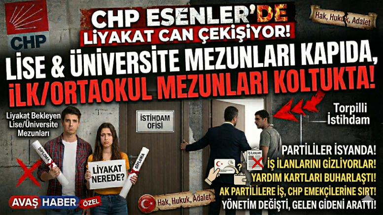 Esenler’de yıllarca eğitim almış lise ve üniversite mezunu CHP’li gençler istihdam ofislerinde liyakat beklerken, ilköğretim mezunu isimlerin önceliklendirilmesi ve hatta aktif AK Partililerin işe yerleştirilmesi yarayı derinleştiriyor. "Gelen gideni arattı" diyen üyeler, mevcut yönetimin kendi çıkarlarını partinin ve halkın önüne koyduğunu vurguluyor.
