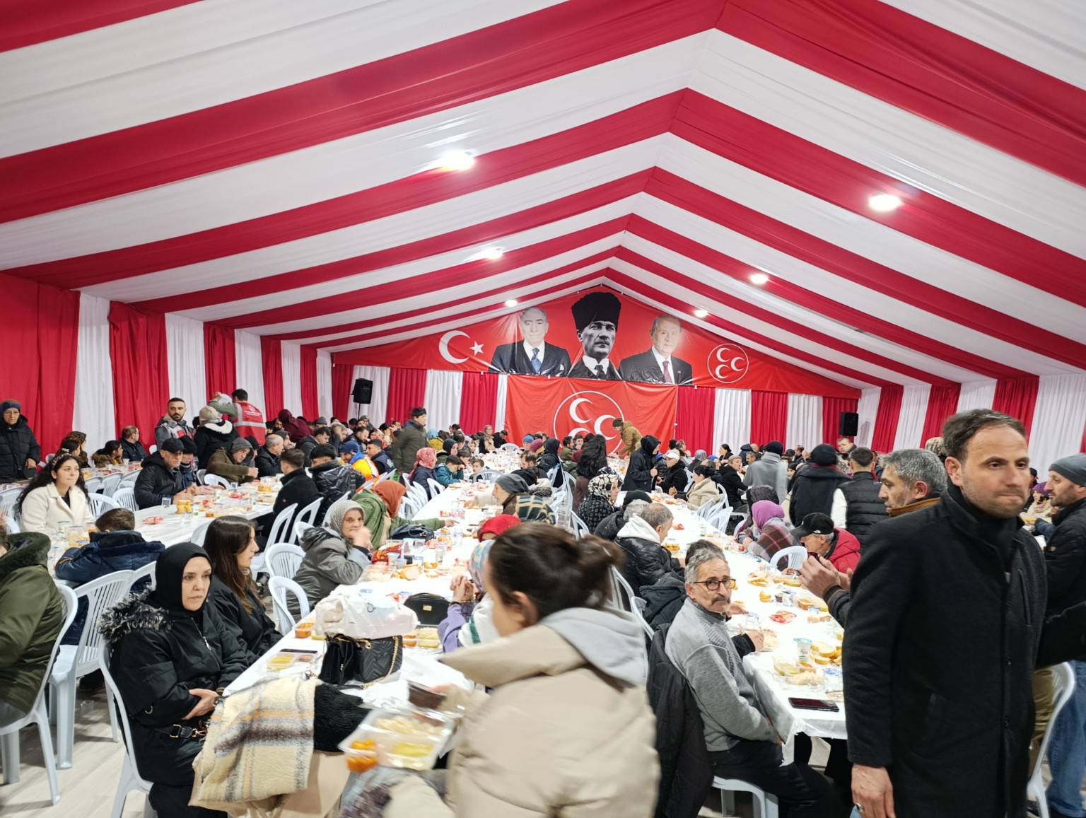 İftar çadırında en çok dikkat çeken detay ise protokolsüz düzen oldu. Özel masa yok, teşkilata ayrılmış ayrı bir alan yok, garson yok. Hizmeti bizzat parti mensupları yapıyor. Başkan Erdoğan da bu yaklaşımıyla ayrışıyor: Yemekleri kendisi dağıtıyor, vatandaşlar yemeğini yiyene kadar ayakta bekliyor, iftarını çorbayla açıyor; millet yedikten sonra, artan yemek varsa yiyor.